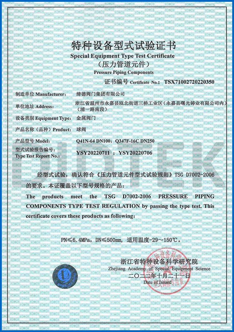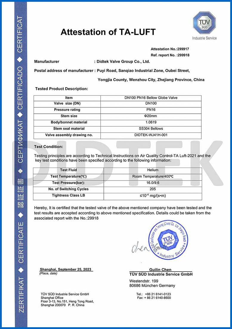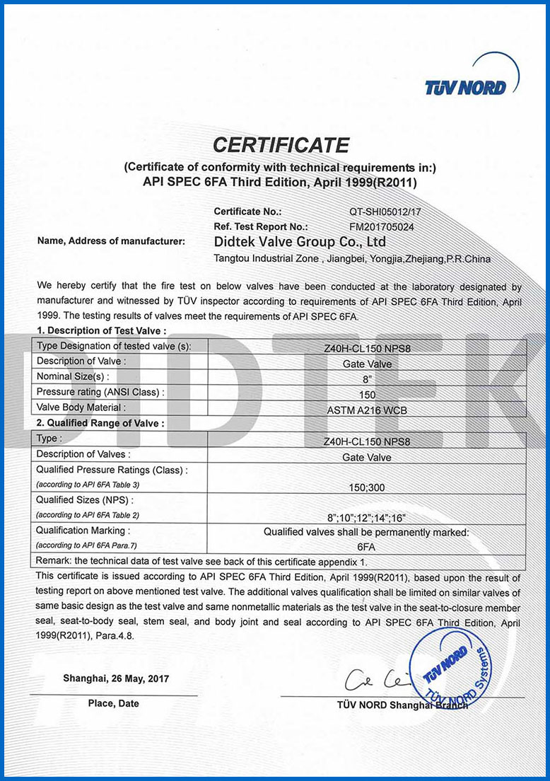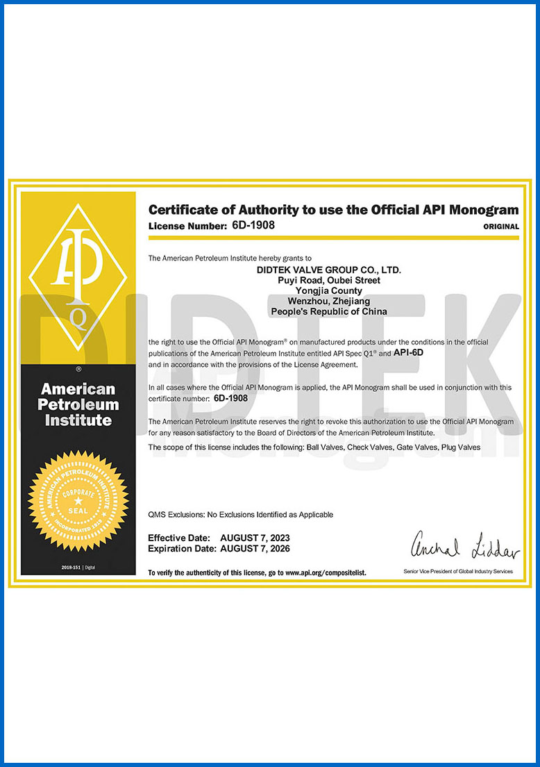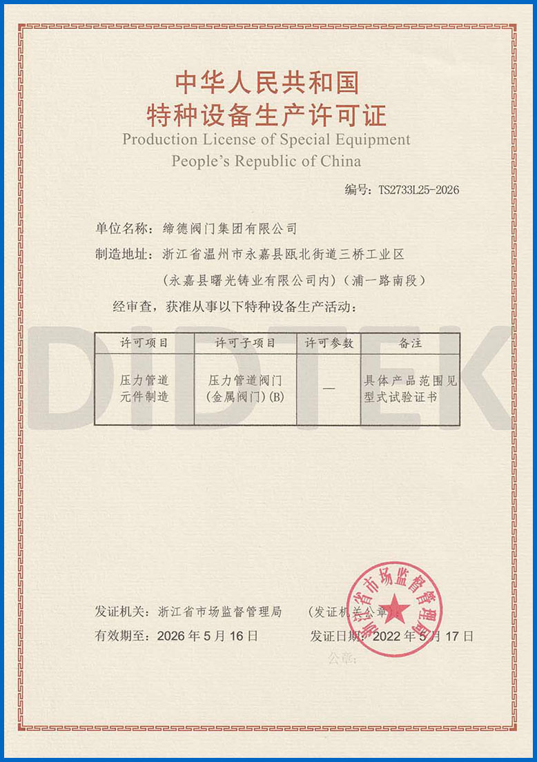 من أجل تعزيز الاعتراف بالعلامة التجارية وتوسيع حصة السوق في العلامة التجارية DIDTEK ، حصلت شركتنا على العديد من الشهادات المهنية على الصعيدين المحلي والدولي. تشمل هذه الشهادات ترخيص تصنيع المعدات الخاصة TS China ، شهادة اختبار نوع المعدات الخاصة ، شهادة نظام إدارة الجودة ISO 9001 ، شهادة API 6D American Petroleum معهد 6D ، Lloyd's Record LRV CE EU CESTURAL الشهادة ، شهادة الاتحاد الجمركي في روسيا (EAC) ، شهادة انبعاثات هارب صمام TA-LUFT ، ISO 15848 Valve شهادة التسرب الدقيقة للانبعاثات الهاربة ، API 607 شهادات الحريق ، شهادة API 6FA Fire ، وغيرها. توفر هذه الشهادات أساسًا متينًا وضمانًا للترويج للعلامة التجارية DIDTEK.