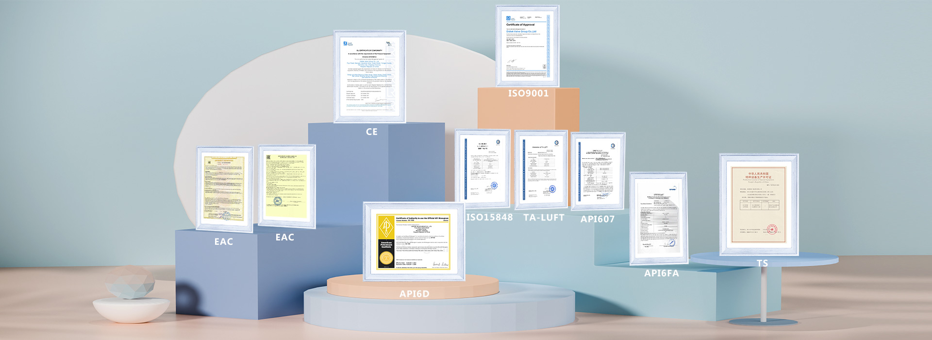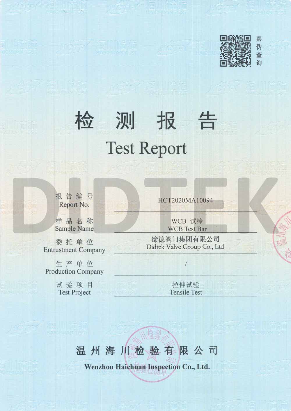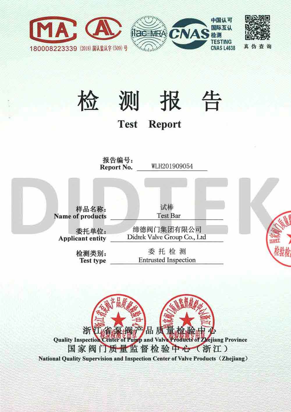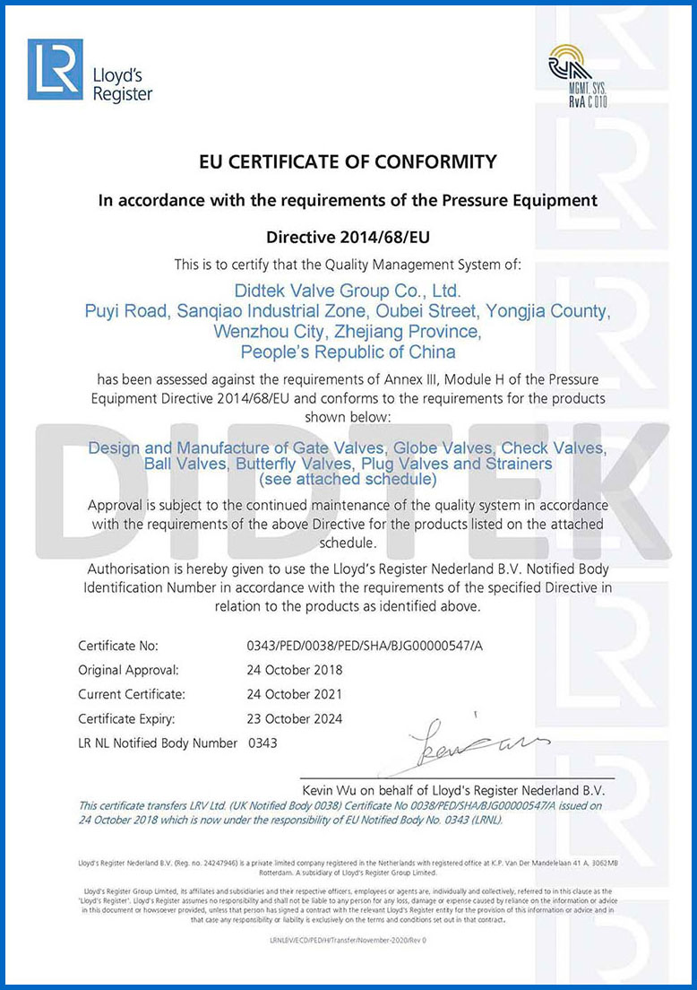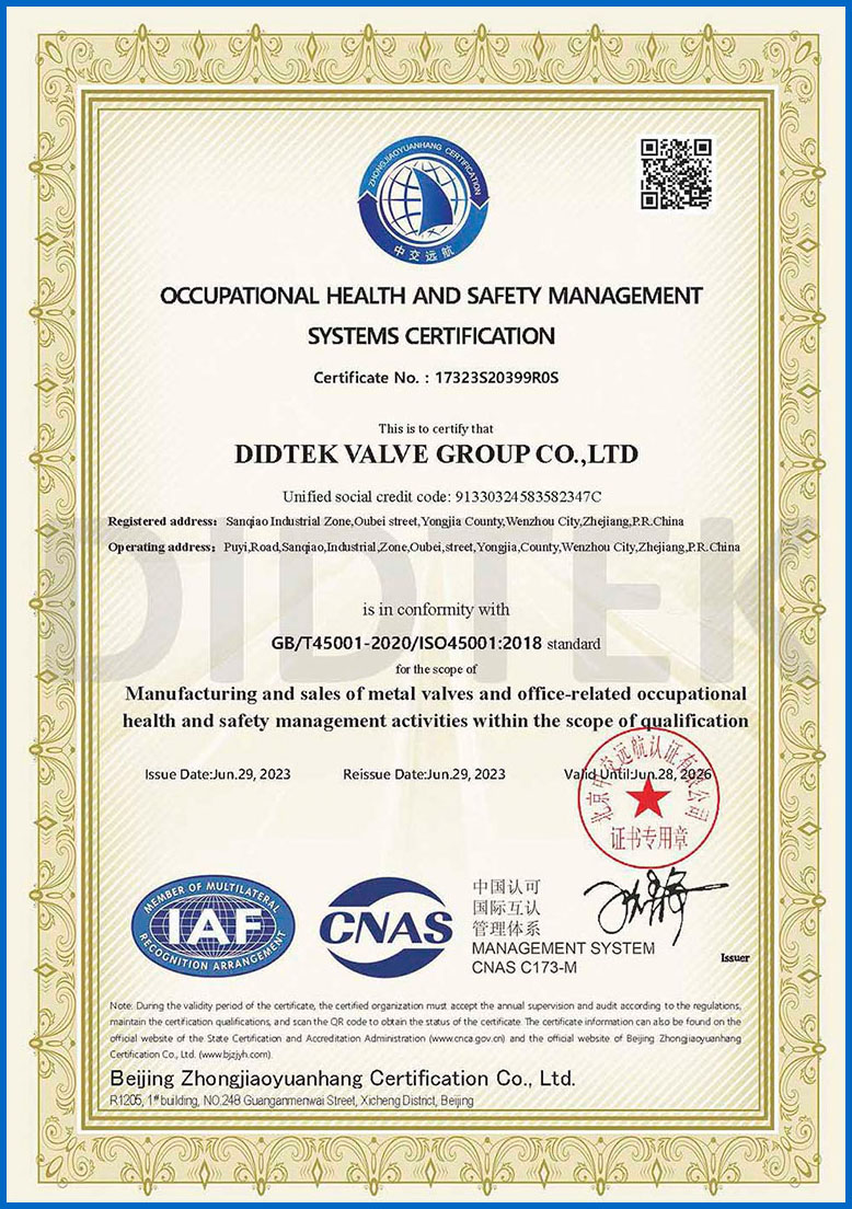 من أجل تعزيز الاعتراف بالعلامة التجارية وتوسيع حصة السوق في العلامة التجارية DIDTEK ، حصلت شركتنا على العديد من الشهادات المهنية على الصعيدين المحلي والدولي. تشمل هذه الشهادات ترخيص تصنيع المعدات الخاصة TS China ، شهادة اختبار نوع المعدات الخاصة ، شهادة نظام إدارة الجودة ISO 9001 ، شهادة API 6D American Petroleum معهد 6D ، Lloyd's Record LRV CE EU CESTURAL الشهادة ، شهادة الاتحاد الجمركي في روسيا (EAC) ، شهادة انبعاثات هارب صمام TA-LUFT ، ISO 15848 Valve شهادة التسرب الدقيقة للانبعاثات الهاربة ، API 607 شهادات الحريق ، شهادة API 6FA Fire ، وغيرها. توفر هذه الشهادات أساسًا متينًا وضمانًا للترويج للعلامة التجارية DIDTEK.