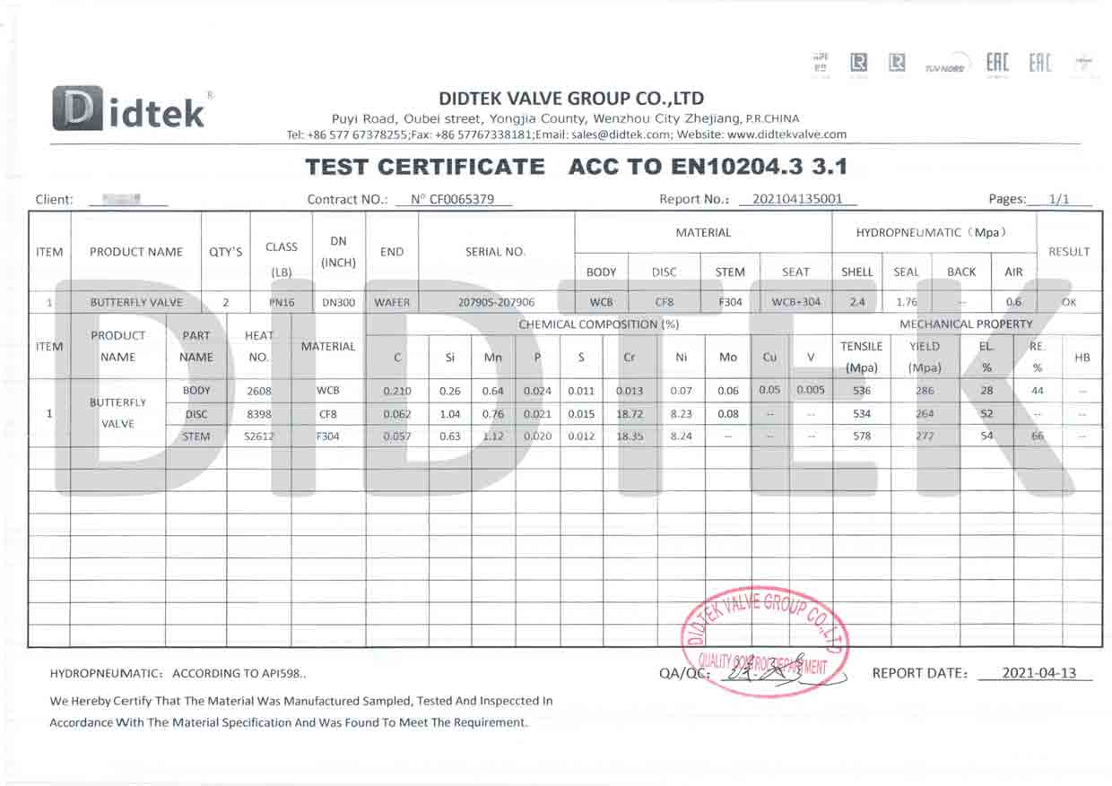 شهادة اختبار صمام الفراشة ACC إلى EN10204.3 3.1