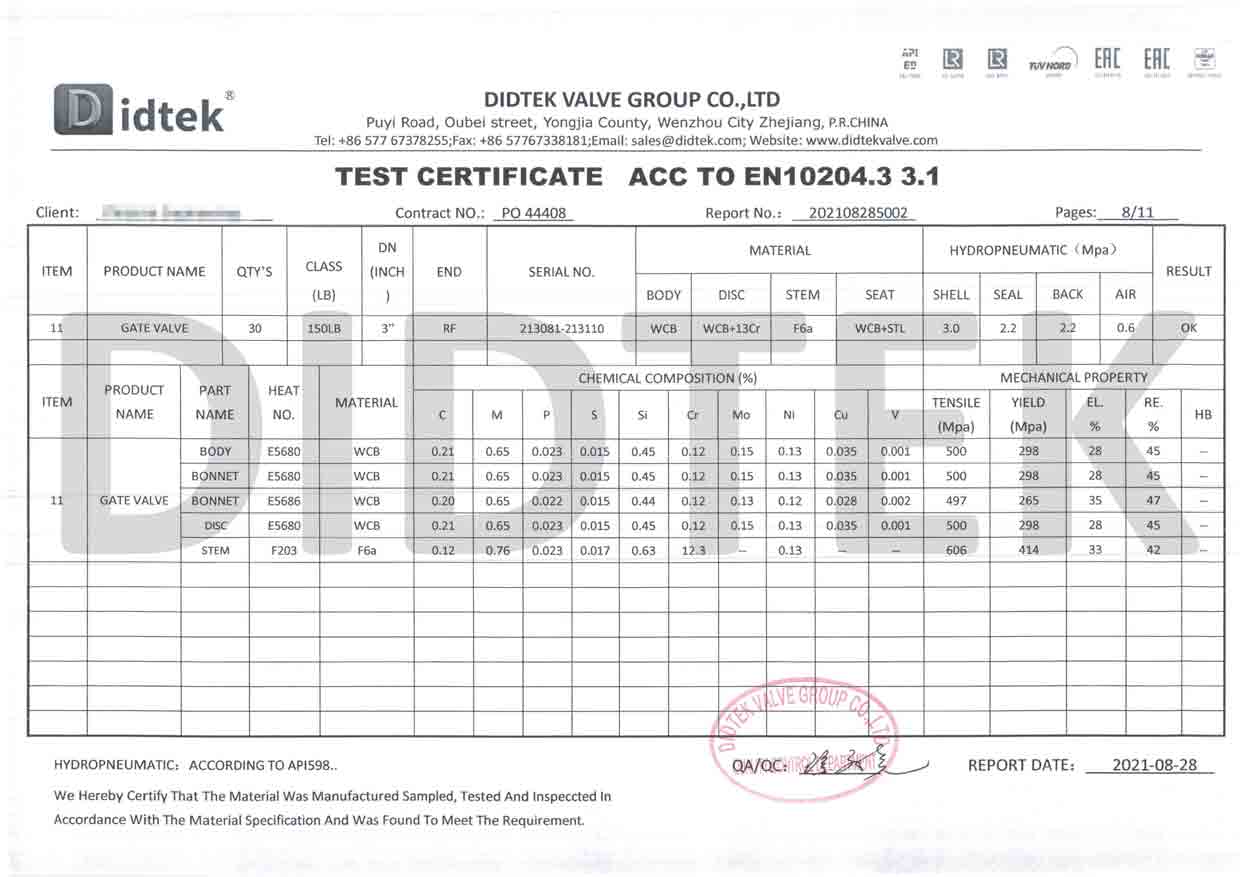 شهادة اختبار صمام البوابة ACC إلى EN10204.3 3.1
