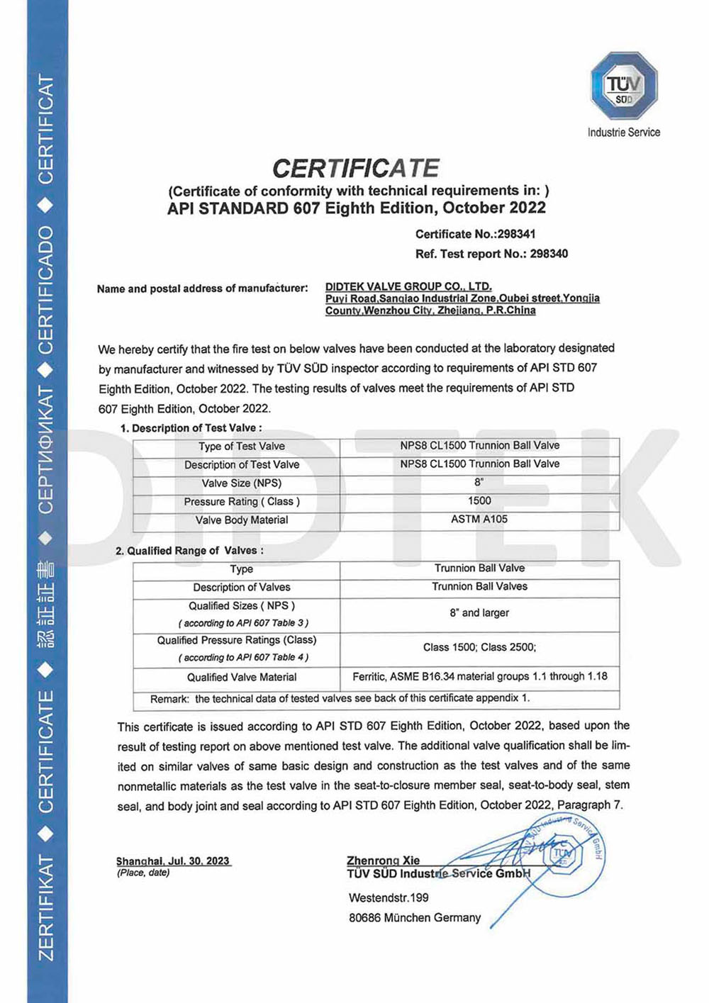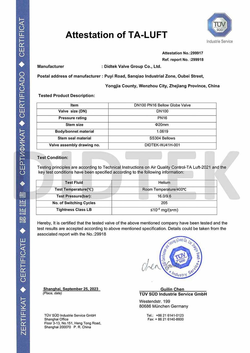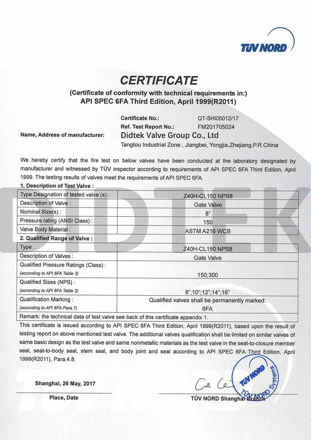 من أجل تعزيز الاعتراف بالعلامة التجارية وتوسيع حصة السوق في العلامة التجارية DIDTEK ، حصلت شركتنا على العديد من الشهادات المهنية على الصعيدين المحلي والدولي. تشمل هذه الشهادات ترخيص تصنيع المعدات الخاصة TS China ، شهادة اختبار نوع المعدات الخاصة ، شهادة نظام إدارة الجودة ISO 9001 ، شهادة API 6D American Petroleum معهد 6D ، Lloyd's Record LRV CE EU CESTURAL الشهادة ، شهادة الاتحاد الجمركي في روسيا (EAC) ، شهادة انبعاثات هارب صمام TA-LUFT ، ISO 15848 Valve شهادة التسرب الدقيقة للانبعاثات الهاربة ، API 607 شهادات الحريق ، شهادة API 6FA Fire ، وغيرها. توفر هذه الشهادات أساسًا متينًا وضمانًا للترويج للعلامة التجارية DIDTEK.